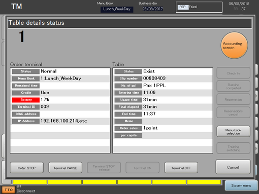 各セルフオーダータブレットの残電池状態表示、遠隔でのリブート、メニュー(ランチ/ディナー等)の切り替え、在庫切れ設定等可能。