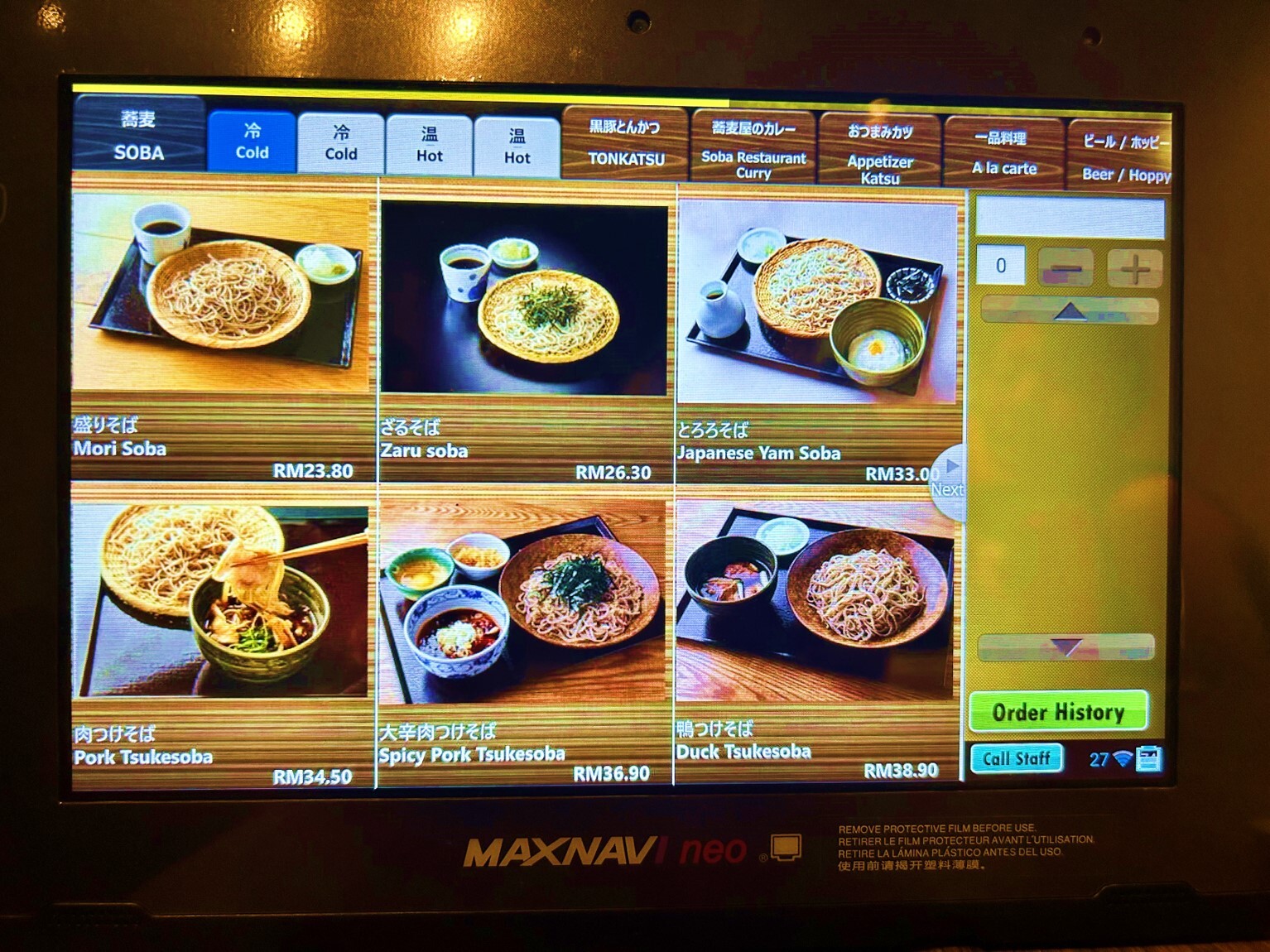 オーダータブレットでは食欲のそそる写真が表示されているだけでなく、ところどころにこだわりの蕎麦の情報や美味しい食べ方等、お客様に美味しく食べて頂ける情報が掲載されており、タブレットによる公告効果も最大限生かされた仕様が顧客満足度向上のお手伝いをしております。