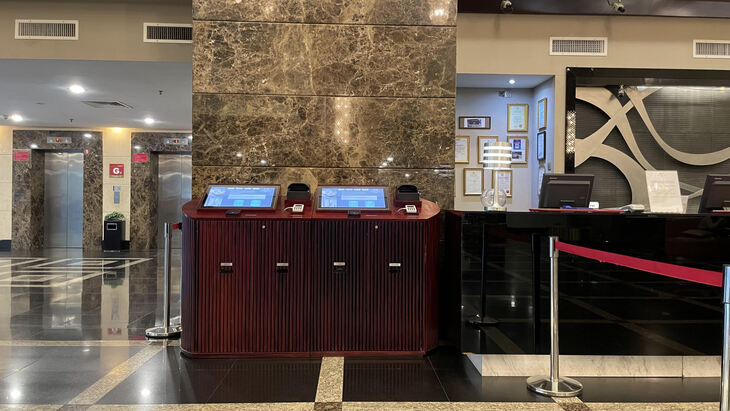 キオスクの家具はホテルのゴージャスなロビーに合わせたデザインに設計されており、家具デザインも画面ユーザーインターフェースについてもホテル様と細部まで慎重にじっくり検討を重ねて作り上げられたものとなっております。